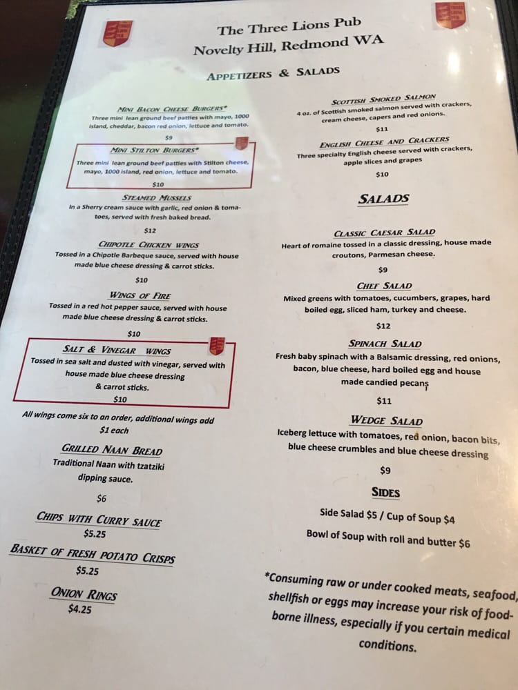 The Three Lions Pub in Redmond, WA is a casual dining spot offering a range of British-inspired dishes. With options like the Chicken Flame Burger, Glazed Salmon, and Lancashire Pasty, there's something for everyone. Night Time Specialties include Chipotle Chicken Wings, Chips with Curry Sauce, English Cheese and Crackers, and Mini Beef Burgers. Customer reviews rave about the friendly staff and delicious food offerings, with mentions of the excellent burgers, fish and chips, and pasties. The ambiance is described as cozy and welcoming, making it a great spot to catch up with friends or watch a game. Overall, The Three Lions Pub provides a satisfying dining experience with tasty food and attentive service.